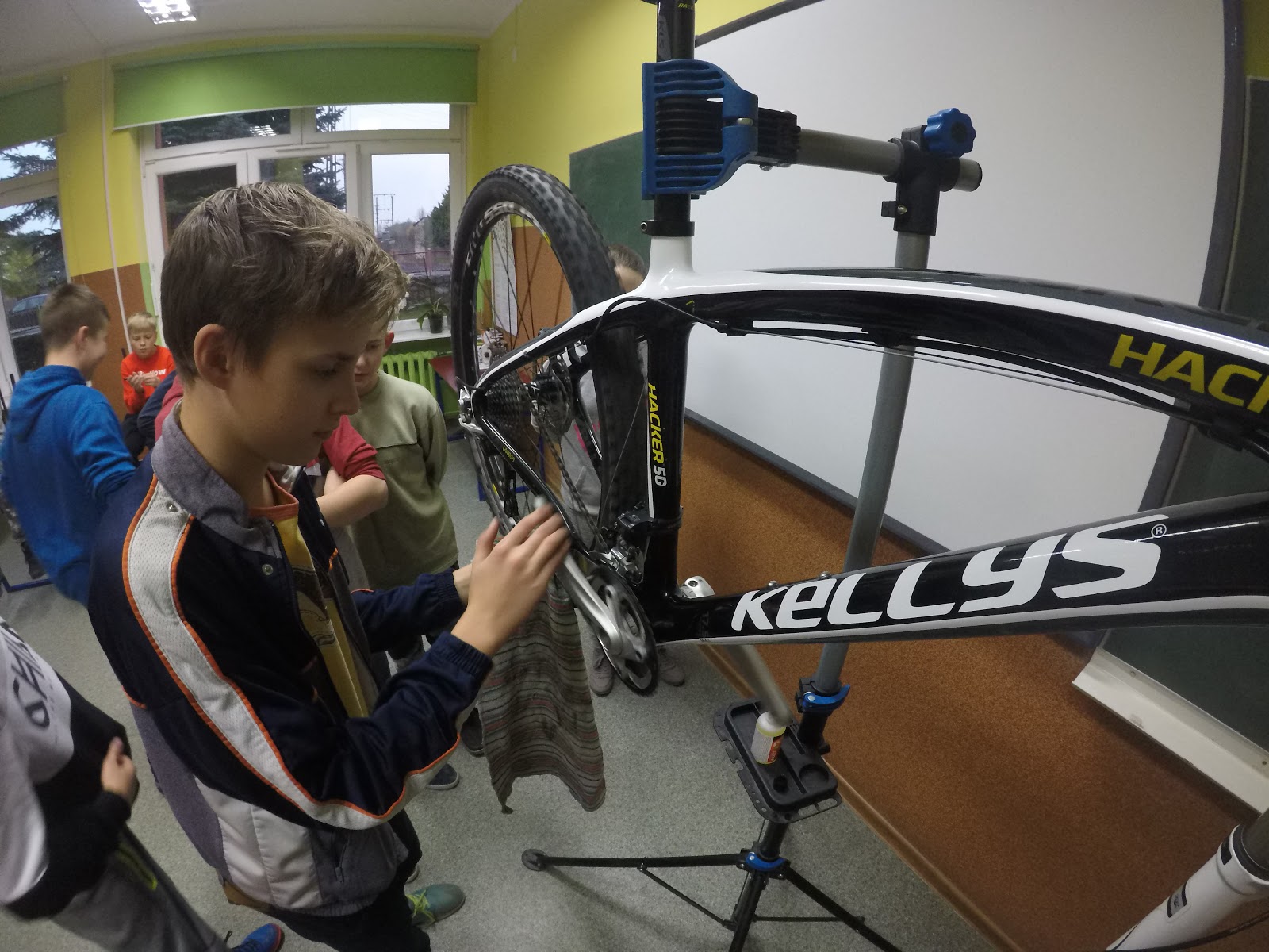 Drugą część zajęć spędziliśmy na „pielęgnowaniu” napędu. Szybkie wyjaśnienie w jaki sposób JA czyszczę napęd, pokazując, na które miejsca trzeba uważać i szmatka oraz oliwka w małe łapki uczniów. Chyba nikt wcześniej z uczniów i ich rowerów nie słyszał o smarowaniu łańcucha bo niektórzy uczniowie na hasło „oliwka” nagle mieli nietęgie miny a gdzieś w oddali padł tekst: „Ale ja nie lubię oliwy.” Wracając do naszego „królika doświadczalnego”… Choć rower przyszedł do nas wyczyszczony to po kilku sesjach czyszczenia, smarowania i wycierania do sucha napęd Hackera chodził dużo ciszej i bardziej gładko niż przed „serwisem”.
